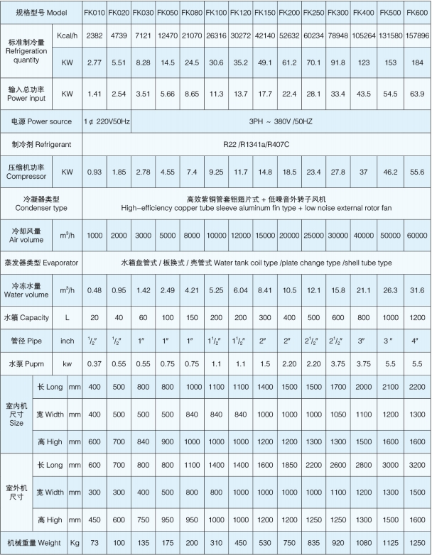 FK 系列分體式風(fēng)冷工業(yè)冷水機(jī),含室內(nèi)機(jī)和室外機(jī)兩部分。該冷水機(jī)壓縮機(jī)、冷凝器、風(fēng)扇安裝在室外,因此熱量盡可能排于室外,且室內(nèi)機(jī)體積小、噪聲低。壓縮機(jī)、水泵、溫控表、壓力控制等關(guān)鍵部件優(yōu)選使用進(jìn)口品牌產(chǎn)品,可靠性高。蒸發(fā)器采用不銹鋼盤管或不銹鋼板換制成,耐腐蝕、抗凍。廣泛用于掃描電鏡、原子吸收、ICP、激光器、真空鍍模機(jī)、離子刻蝕機(jī)、氧氮分析儀、透射電鏡、衍射儀、勞光光譜儀、離子束外延、分子束外延等分析儀器以及大功率X 射線衍射儀、疲勞試驗(yàn)機(jī)、大型釬焊爐、大型真空焊接等設(shè)備中。同時(shí)在醫(yī)療儀器、機(jī)床設(shè)備和液壓系統(tǒng)中也得到了廣泛運(yùn)用。