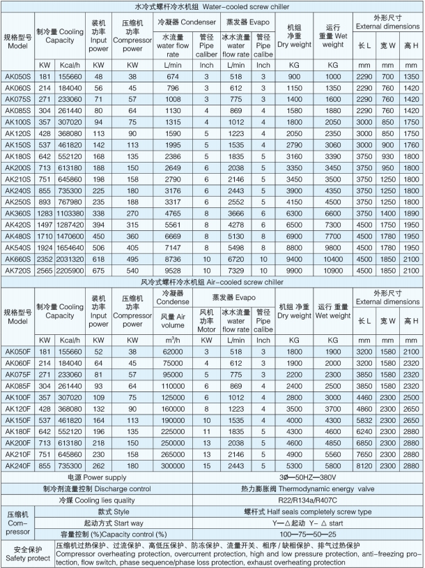 AK 系列螺桿冷水機(jī)組優(yōu)選采用國(guó)際知名品牌螺桿壓縮機(jī),配套優(yōu)質(zhì)高效節(jié)能銅管制作冷凝器,蒸發(fā)器及世界名牌控制元件,使機(jī)組具備體積小、噪音低、能量大、壽命長(zhǎng)、操作簡(jiǎn)便等優(yōu)點(diǎn),其優(yōu)美精巧的外形設(shè)計(jì)和可靠穩(wěn)定的高效能品質(zhì)在同類產(chǎn)品中出類拔萃!