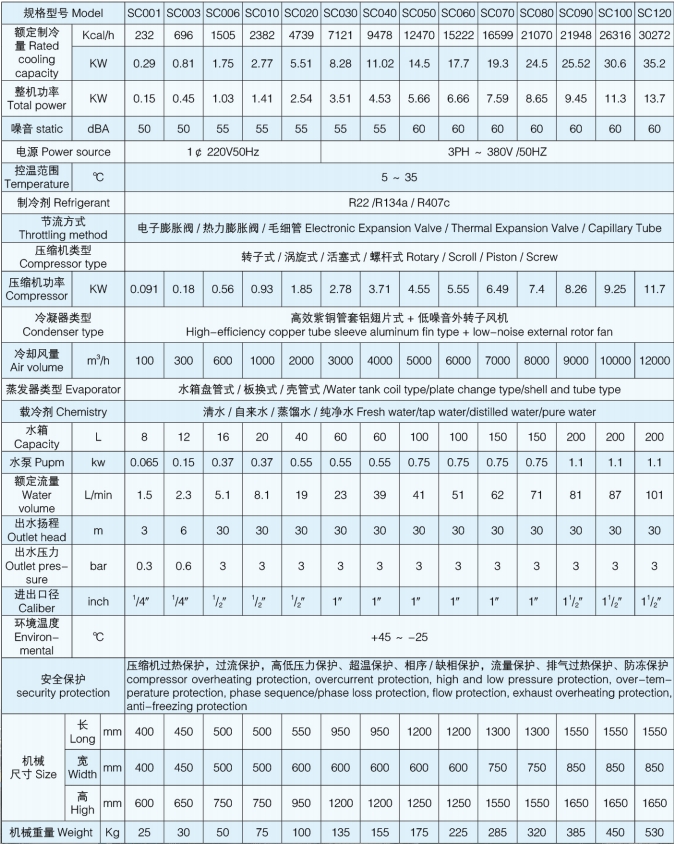 SC 系列小型冷水機具有體積小、安裝使用方便、在室內(nèi)可任意移動等特點,因壓縮機、水泵、溫控表、壓力控制等使用的是優(yōu)選進口產(chǎn)品,所以性能良好,噪聲低。蒸發(fā)器一般采用不銹鋼盤管制成,耐腐蝕、抗凍、這類機型被廣泛地用于激光器、3D 打印機,真空鍍模機、離子刻蝕機、氧氮分析儀、衍射儀、熒光光譜儀等分析儀器中,以及醫(yī)療儀器、機床設(shè)備及液壓系統(tǒng)中。